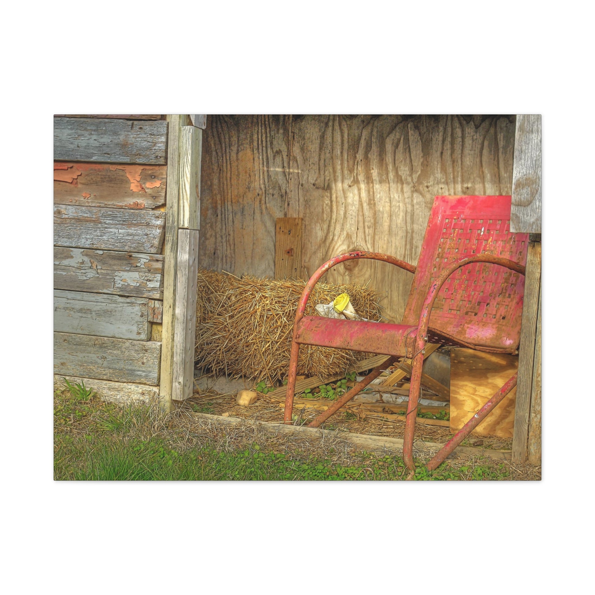 This beautiful old weathered steel patio chair has stood the test of time and now finds itself nestled inside an old wooden building. The chair oozes rustic charm and character, with the years of weathering adding a unique patina to the steel. The Photoshop oil paint filter has been used to accentuate the chair's rugged texture and give it an even more authentic vintage look. This chair is the perfect addition to any space that craves a touch of country living and a nod to the past. So sit back, relax, and enjoy the cozy warmth of a bygone era.